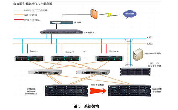 2、后端采用公司推出的新一代统一存储产品 GS5120FD 存储作为虚拟服务器的共享存储,为虚拟机和ISO Library提供存储空间。