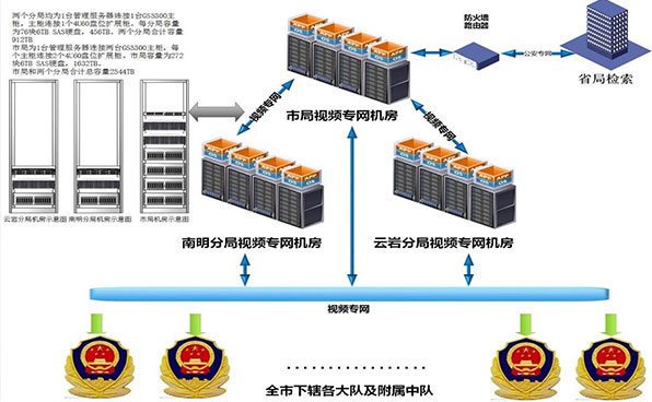 客户上线系统放置在三个视频专网机房,分别是贵阳市公安交通管理局南明区分局、云岩区分局和市局机房。南明区、云岩区分局配置相同,均为 1 台管理服务器连接 GS5300 存储主机,存储主机连接 1 台 4U60 盘位扩展柜,由 76 块 6TB 硬盘组建阵列,裸容量 456TB, 两个分局合计裸容量 912TB。市局配置为 1 台管理服务器连接光纤交换机与 2 台 GS5300 存储主机连接,每台存储主机连接 2 台 4U60 盘位扩展柜,由 272 块 6TB 硬盘组建阵列,裸容量 1632TB。三处机房存储设备总容量超过 2500TB,为贵阳市公安交通管理局执法记录平台存储核心记录。