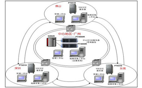 在XX中心区只放置WWW服务器、认证服务器、计费服务器、数据库服务器、管理服务器、管理工作站及部分流媒体服务器,由中心进行统一管理、统一计费,以统一的门户向全区用户提供服务,用户在中心统一认证,而其他的流媒体服务器分布放置在周边AA、BB、CC,形成VOD服务器系统的级联。在中心地区的流媒体服务器性能最好,采用mg电玩娱乐在线网址高端四路至强服务器PT4845P,双机集群实现媒体资源中心的服务;周边地区的流媒体服务器的推荐性价比优良的至强(扩展64位)塔式PT6510P实现,并随着根据本地范围用户数的增加以后再进行增加。各地的流媒体服务器也都可以向整个中心地区及其他周边地区的用户服务,各地服务器之间进行负载平衡,实现节目动态分布、自动分发以解决高并发流的要求。系统整体部署图: