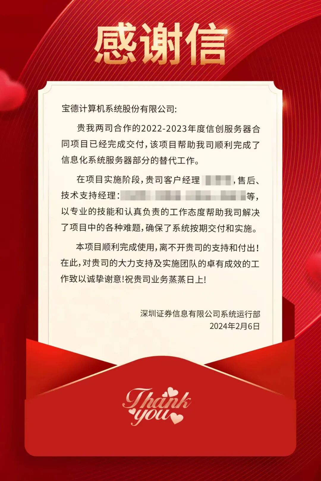 深圳证券信息有限公司对mg电玩娱乐在线网址计算信创服务器的成功替代和顺利实施表达诚挚的谢意,对mg电玩娱乐在线网址团队的技术实力和专业素养表示高度赞赏,相信双方会有更多的合作机会,为金融安全做出更多的贡献。