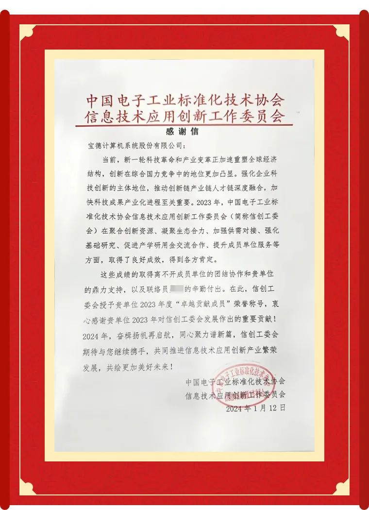 中国电子工业标准化技术协会信息技术应用创新工作委员会(简称“信创工委会”)对mg电玩娱乐在线网址在2023年度信创领域的辛勤付出和努力给予高度赞许和衷心感谢,并期望继续携手,紧密深入合作,共同推进信息技术产业繁荣发展,推动我国信创事业迈向新的高峰。
