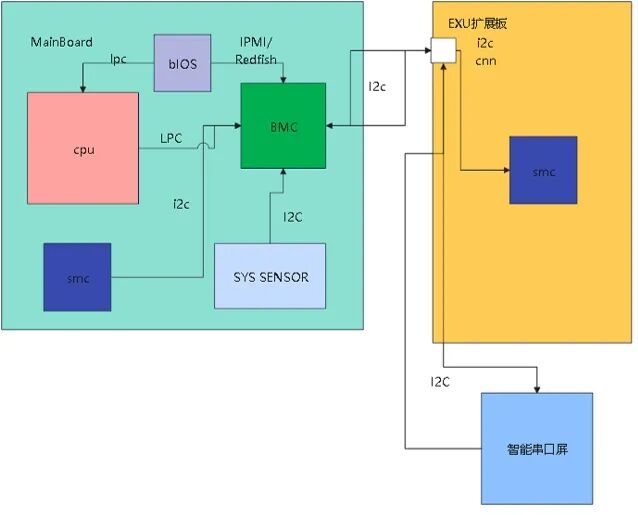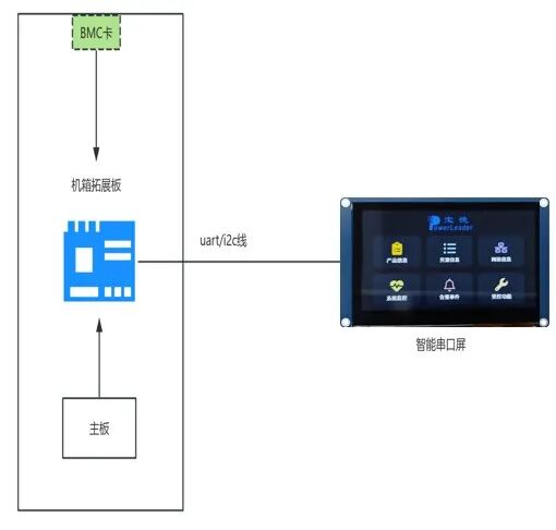 通过重新设计BMC的低速总线接口,分出一组i2c线,连接到机箱外部,将智能串口屏与BMC相连。同时通过卡扣等方式将智能串口屏接在机箱上,支持可选配拆卸。利用在扩展板上适配I2C转串口模块,基于I2C模拟特定串口协议来实现BMC与串口屏通信。