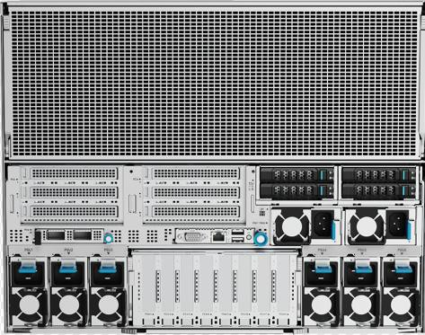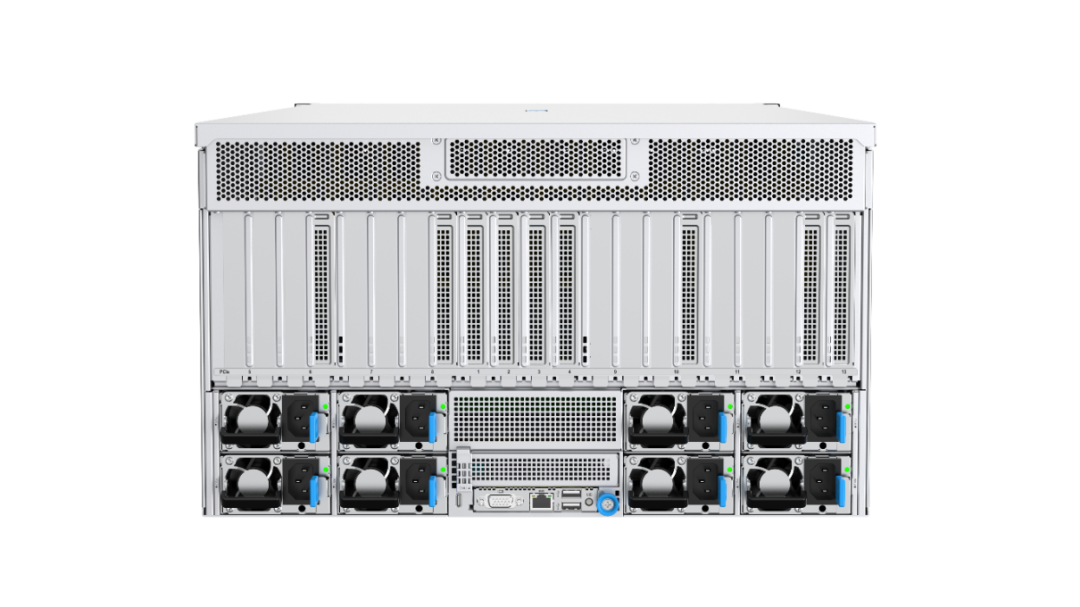 PR8908E2凭借超强性能、开放架构与全场景适配能力,成为驱动AI技术升级与普惠落地的核心引擎。它采用 8U 双路设计,最高 128 核心的至强处理器和 8 张高性能 GPU 加速卡,提供了高达 2.4 倍于前代产品的计算密度。它配备 32 个 DDR5 内存插槽、29 块 2.5 寸硬盘及 12 块 NVMe 硬盘,结合 18 个 PCIe 5.0 扩展槽与 OCP 3.0 高速网络,能够满足 AI 大模型万亿级 token 数据处理需求。尤其值得一提的是,它深度兼容 OAM(开放加速模块)标准,支持多品牌 GPU 加速卡与异构计算架构、以及千/万加速卡互联,能够无缝适配 DeepSeek、QWQ 等国内外主流 AI 框架,满足客户对多元算力的混合部署需求,有助降低企业技术迁移成本。