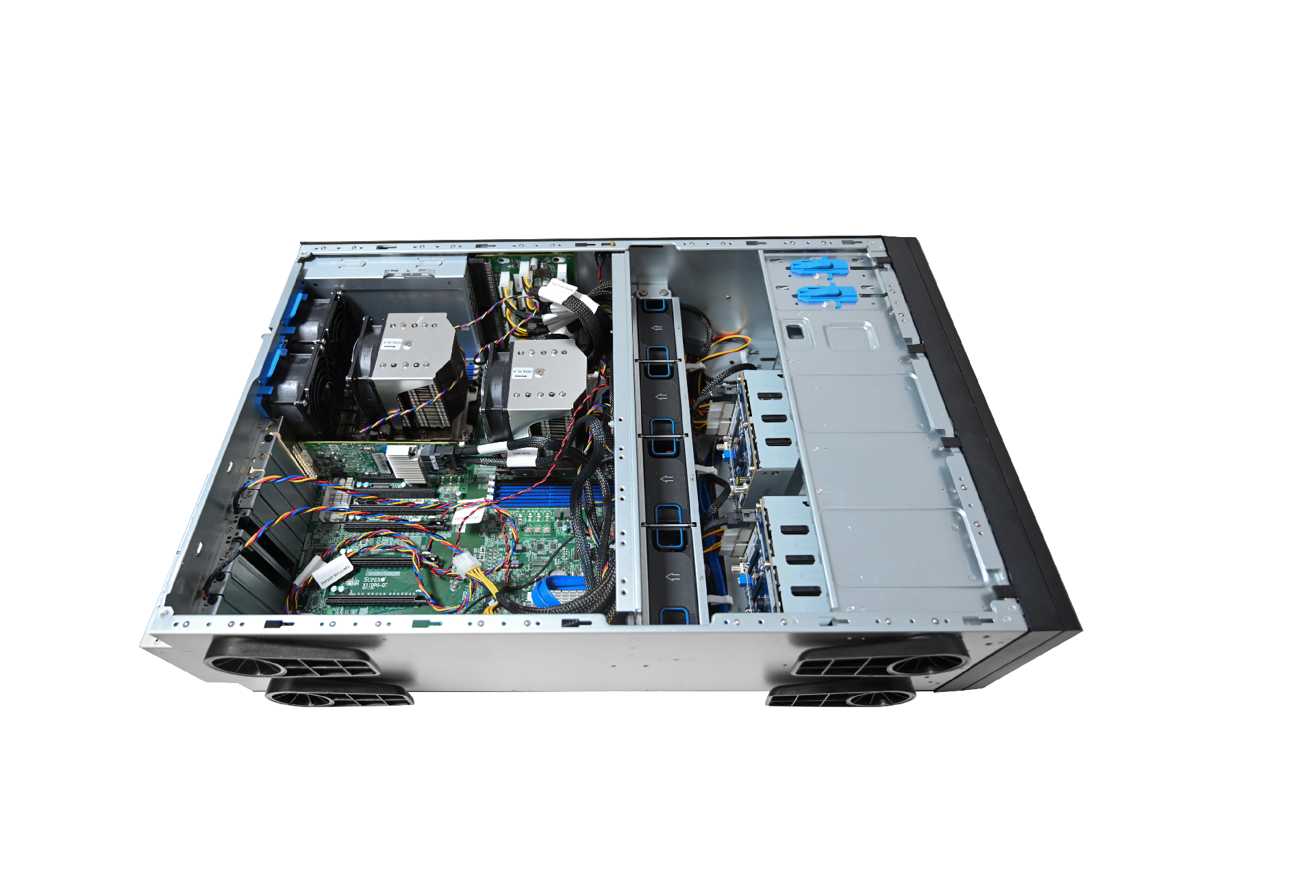 全新一代AI服务器PR4904W是mg电玩娱乐在线网址公司新推出的一款4U双路机塔互换式加速计算服务器。采用Intel C621A高性能芯片组,支持第三代英特尔®至强®可扩展处理器;该机型拥有16个DDR4 3200MHz DIMMs插槽并最多支持6TB内存容量;支持8块3.5英寸热插拔NVME/SAS/SATA硬盘及内置2块3.5英寸/4块2.5英寸SAS/SATA硬盘;拥有4个全高全长双宽的PCIe 4.0 GPU插槽,并另提供2个PCIe 4.0 x16插槽,1个PCIe 4.0 x8插槽;板载集成2个万兆网络接口,支持多种不同网络选择:以太网、InfiniBand,OPA;可实现高速性能和I/O灵活性,满足不同应用程序的互联需求;板载集成BMC;支持IPMI 2.0远程管理;2200W CRPS冗余电源。