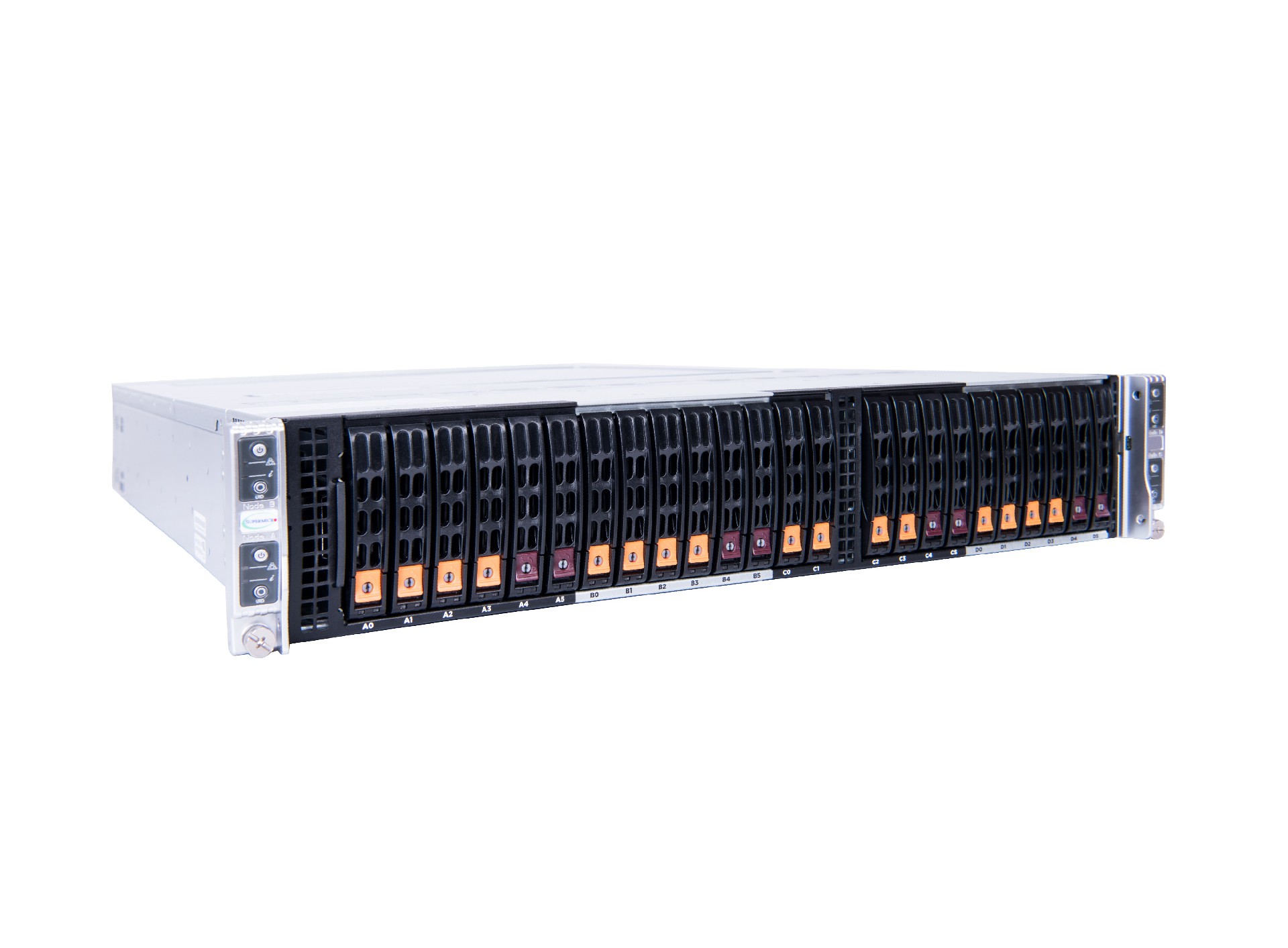 单个2U机框中装有多达4个半宽双路服务器节点以及24个2.5寸热插拔硬盘。