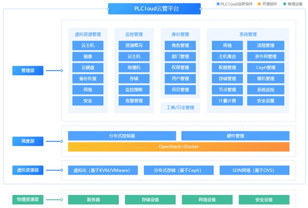 PLCloud云管平台主要包括虚拟资源管理、监控管理、工单管理、日志管理、身份管理、系统管理等功能,集中了弹性可扩展计算、分布式块存储和软件定义网络(SDN)等核心技术,通过对硬件设施进行虚拟化处理,形成云化的资源池,该资源池可按需为每个用户提供基础IT资源,包括计算资源、存储资源和网络资源,快速适应动态变化的业务需求,实现弹性资源分配。