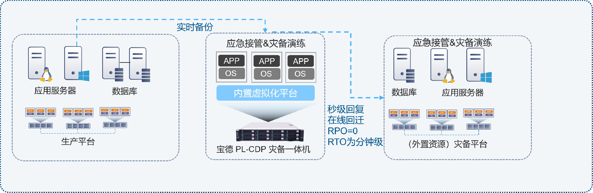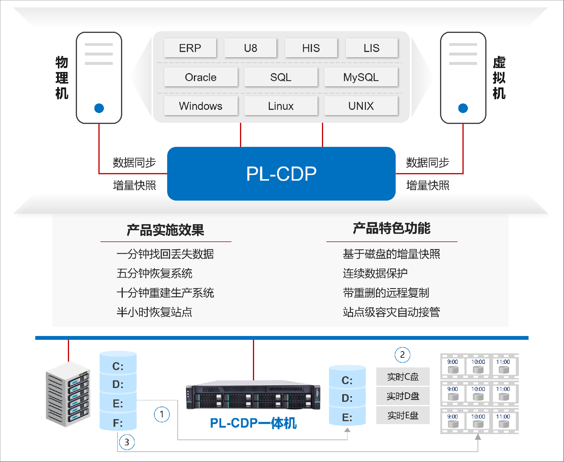 PL-CDP实时备份系统可提供演练、验证、测试的备份数据的可用性,可通过容灾系统记录源端任意时间点IO变化,构建成业务主机的多数据副本;基于内置或外部接管平台,实现在线业务系统的数据备份、业务容灾、仿真测试;简化用户业务连续性的综合保障性方案的复杂度,降低各种风险。