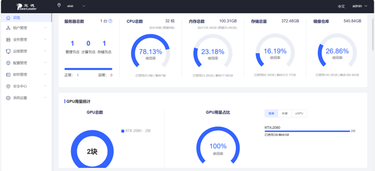 平台支持服务器集群统一纳管,整合硬件资源,集群化管理和使用。并以套餐的形式对用户分配硬件资源。针对大模型可一键生成单机多卡、多机多卡等分布式训练框架环境;针对多用户小任务可对GPU进行切分使用,提高资源利用率。