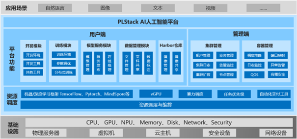 PLStack平台采用容器轻量级虚拟化方式作为基础,实现对多集群多节点的GPU、CPU、内存、存储等基础设施资源池化;基于Kubernetes定制化开发的编排调度工具,实现资源高效灵活调度;同时企业级设计理念使平台具备多租户多层级用户管理、权限管理、资源管理、vGPU等丰富的平台能力,全方位满足用户对AI开发平台高可用、高可靠、高稳定要求。大大缓解深度学习算法训练的瓶颈,从而释放人工智能的全新能力,让用户不再因为GPU的昂贵望而却步。