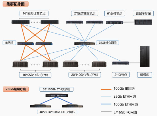 计算网络采用高速的100G IB网络,确保用户的计算任务在运行过程中不受网络带宽的限制,业务网络使用25G以太网路,延迟低速度快。两层高速网络保障集群中所有节点无阻塞、全线速的运行,可充分满足高速互联的需求。