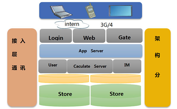 ♢ 逻辑层:负责各项业务的逻辑处理,比如订单财务逻辑,游戏各服务逻辑,及时通讯逻辑等