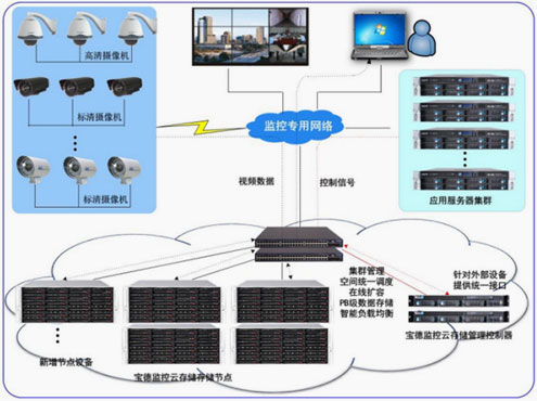 平安城市等大规模视频监控项目中,监控前端接入数量巨大,存储周期长,再加上高清摄像码流在平安城市项目的广泛应用,因此存储容量规模巨大,一般以公安分局为监控分中心,实现分局范围内集中存储,重要视频上传市局或省厅集中存储,在市局或省厅进行统一指挥高度。集中存储系统不仅需要满足存储回放需求,还要支持对突发事件的快速响应,基于视频分析的指挥决策等;由于平安城市项目的特点,对集中存储系统提出如下需求: